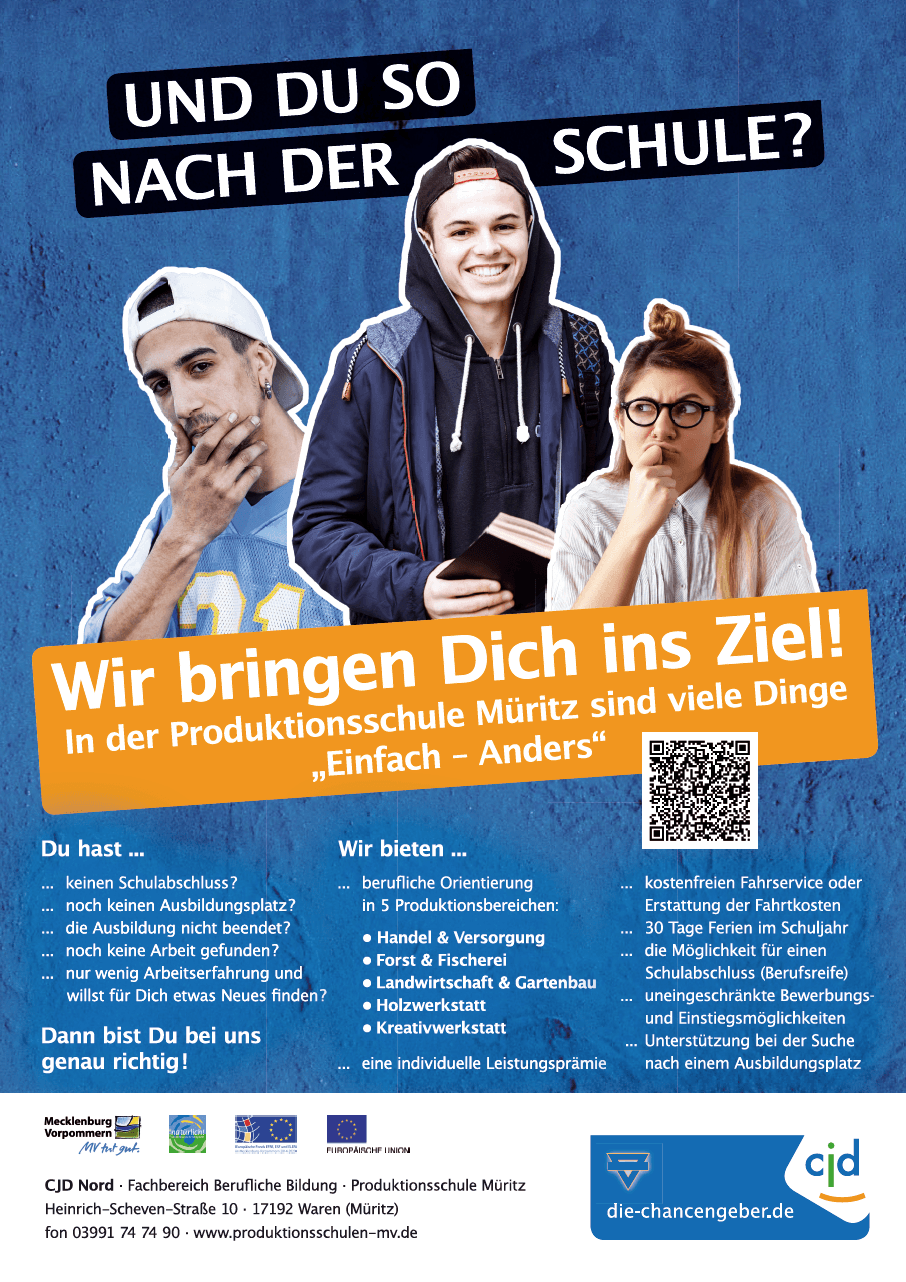 Am 29. April 2025 findet der "Tag der offenen Tür" der Produktionsschule Vorpommern-Greifswald am Standort Wolgast und am 07. Mai 2025 der "Tag der offenen Tür in der Produktionsschule Vorpommern-Rügen" statt. Am 15. Mai 2025 öffnen die Produktionsschulen Müritz und Vorpommern-Greifswald, Standort Torgelow, ihre Türen. An allen Standorten erhalten Besucher*innen Einblicke in die praxisorientierte Arbeit der Produktionsschulen, Projekte und Angebote für junge Menschen.